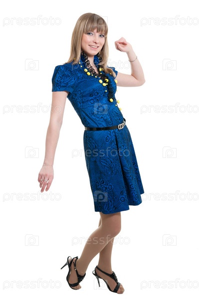 Девушка в синем платье на белом фоне