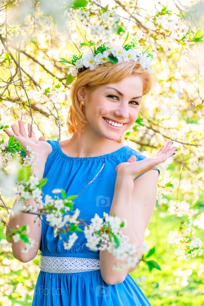 Романтичная девоушка с венком из цветов у цветущего дерева