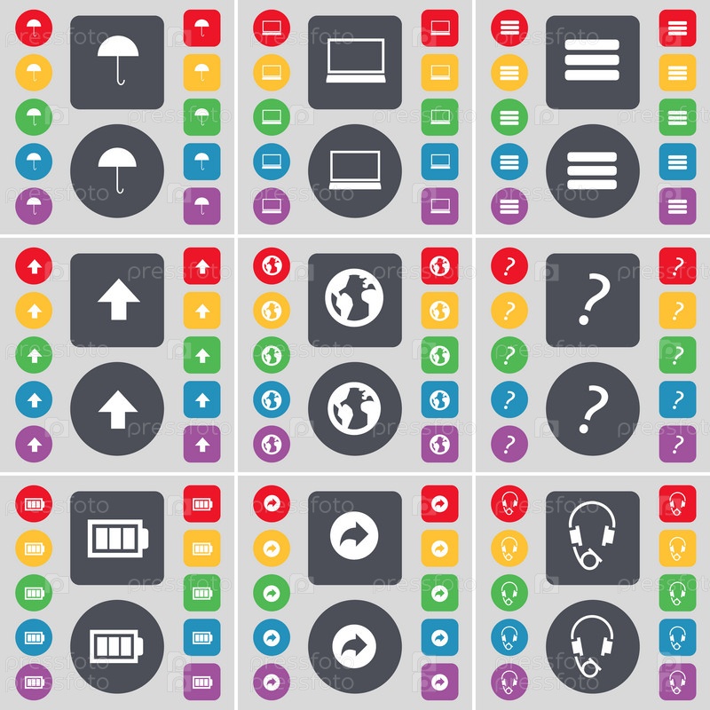 Зонтики, ноутбук, приложения, стрелка вверх, земля, вопросительный знак, батарея, обратно, символ значка наушников. Большой набор плоских цветных кнопок для вашего дизайна. вектор