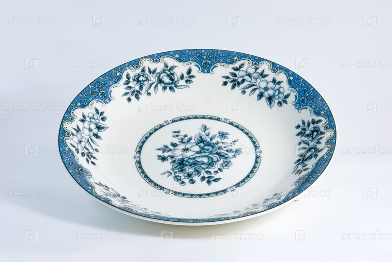 Бело синяя фарфоровая тарелка, макро