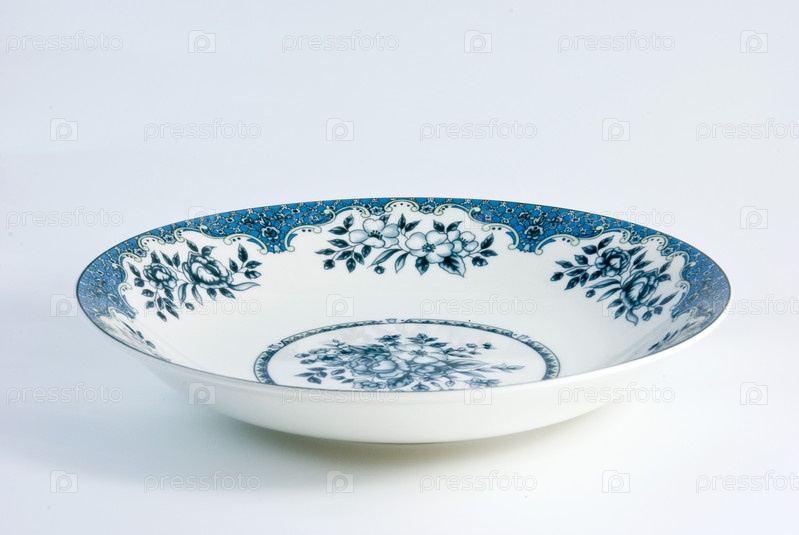 Бело синяя фарфоровая тарелка, макро