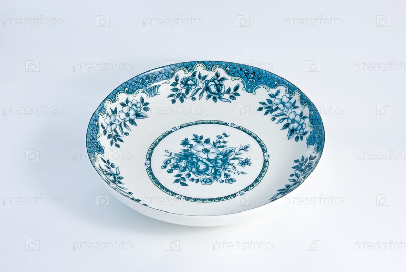 Бело синяя фарфоровая тарелка, макро