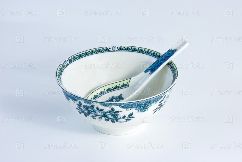 Бело синяя фарфоровая чаша с ложкой