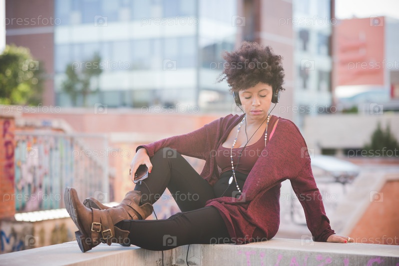 Черные кудрявые волосы Африканская женщина прослушивания музыки с наушниками