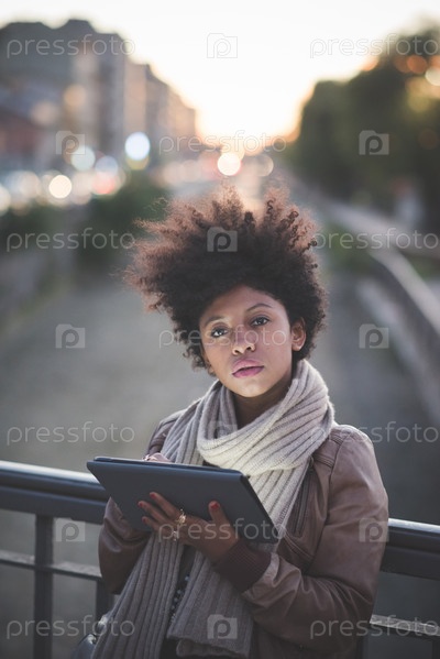 Черные кудрявые волосы Африканская женщина с помощью планшета