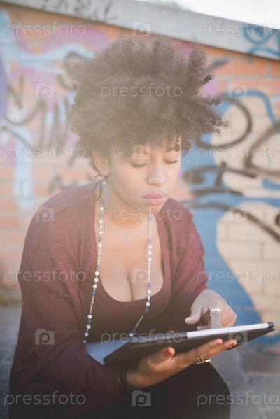 Африканская женщина красивые черные кудрявые волосы с помощью планшета