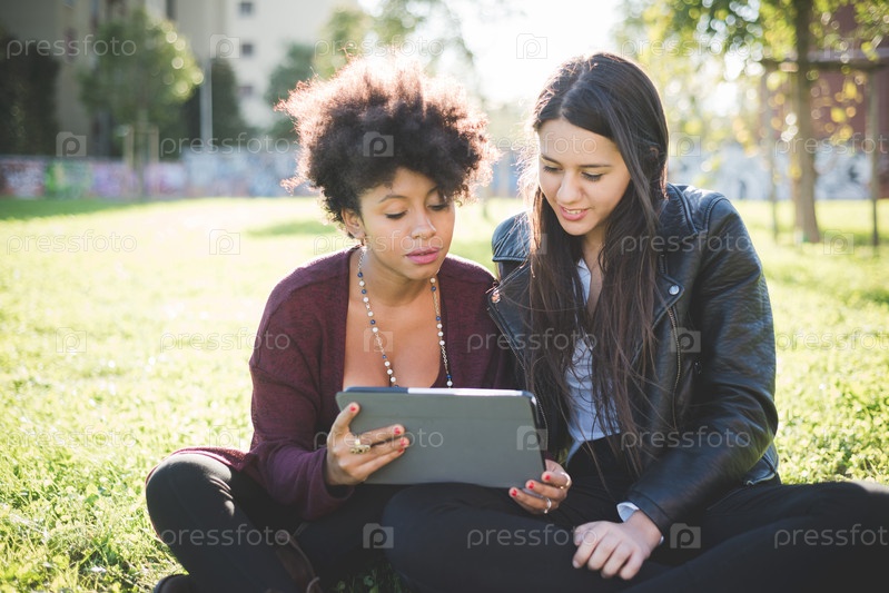 Два многонациональное красивая молодая женщина черный и Кавказа с помощью Планшетные