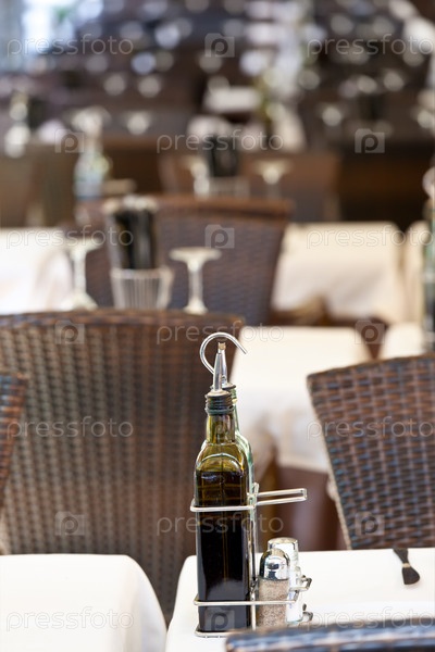 Бутылка оливкового масла и специи на столе в пустом итальянском ресторане