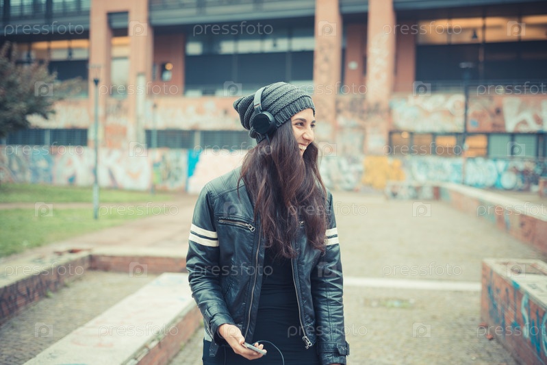 Молодая красивая женщина брюнетка с наушниками