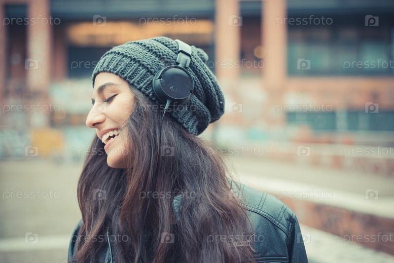 Молодая красивая женщина брюнетка прослушивания музыки с наушниками