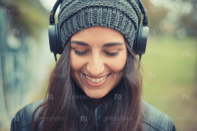 Молодая красивая женщина брюнетка прослушивания музыки с наушниками