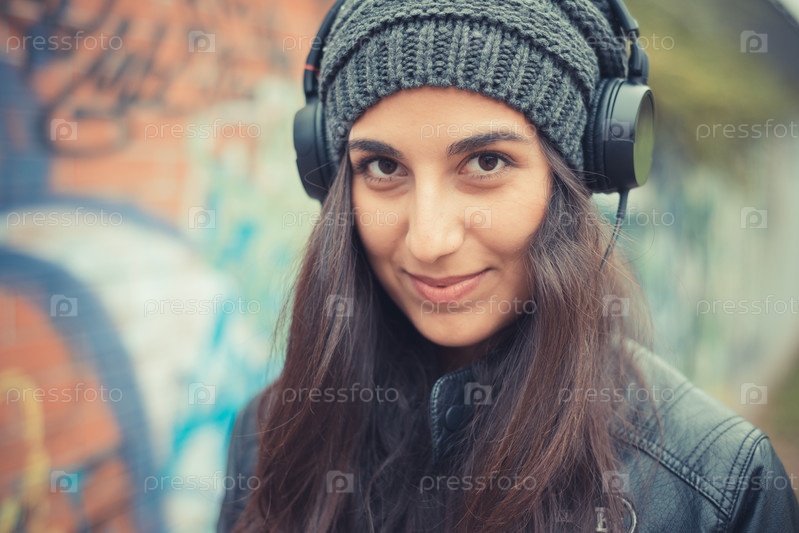 Молодая красивая женщина брюнетка прослушивания музыки с наушниками