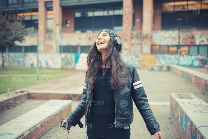 Молодая красивая женщина брюнетка прослушивания музыки с наушниками
