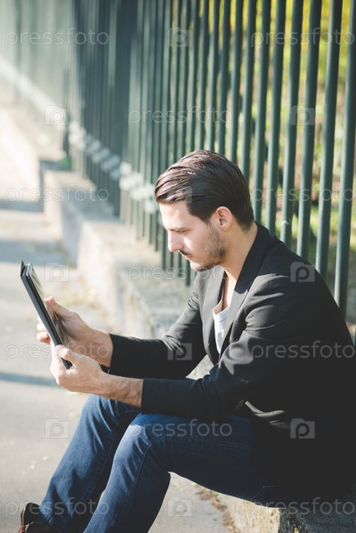 Молодой итальянский парень, использует планшет