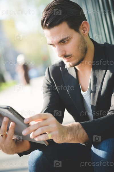 Молодой итальянский парень, использует планшет