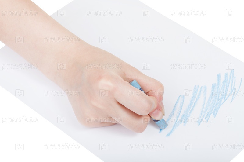 Рука рисует голубая пастель на листе бумаги