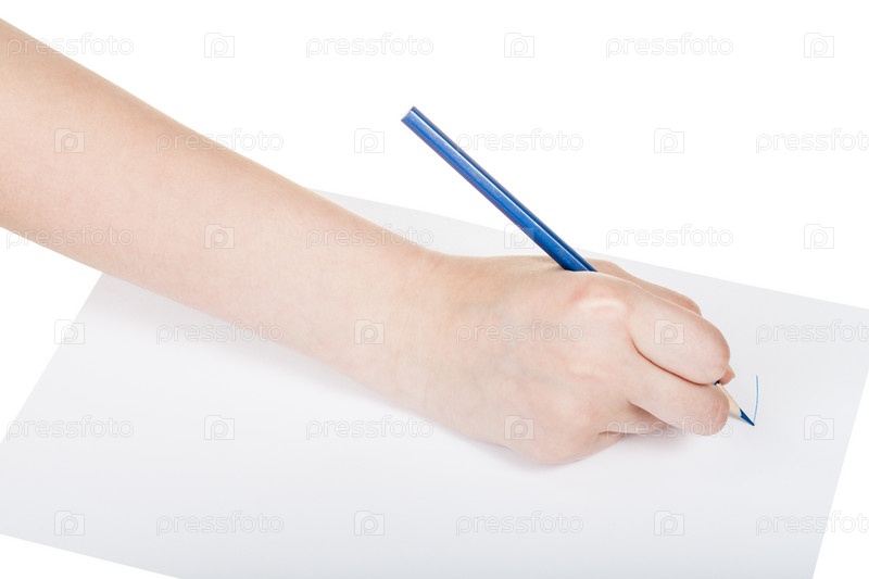 Рука рисует синим карандашом на листе бумаги