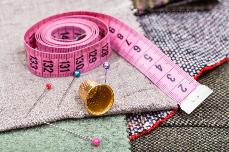 Розовая лента меры, булавки, наперсток на текстиле