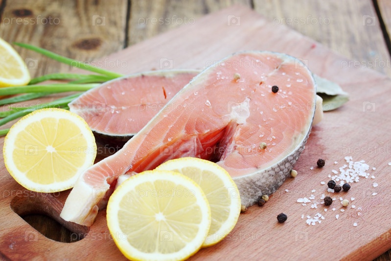 Стейки сырой красная рыба с лимоном и специями