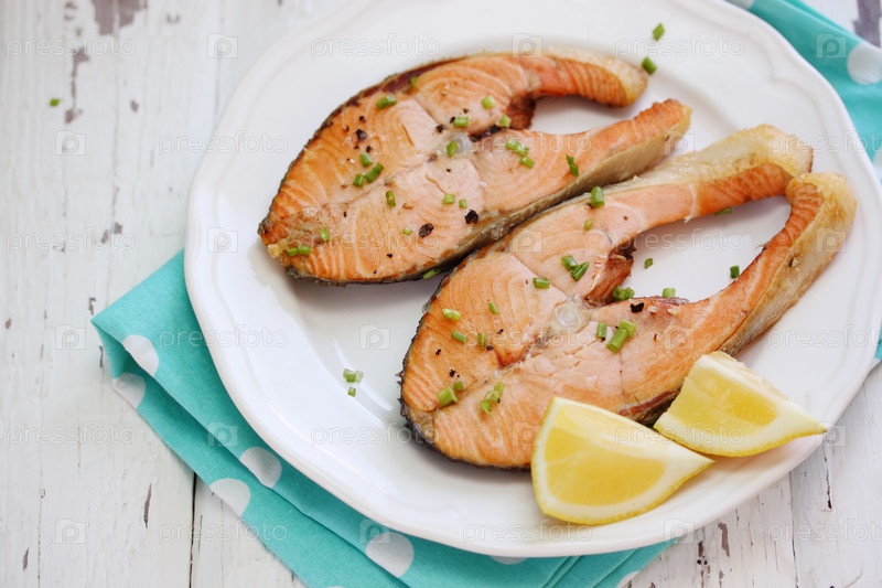 Стейки жареная красная рыба с лимоном и специями
