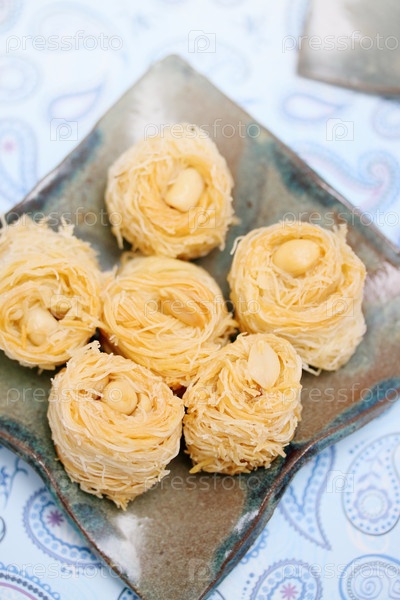 Восточный десерт, мед Пахлава с орехами на тарелке