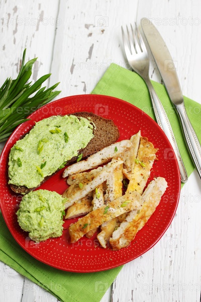 Нарезать белое мясо и чесночным маслом