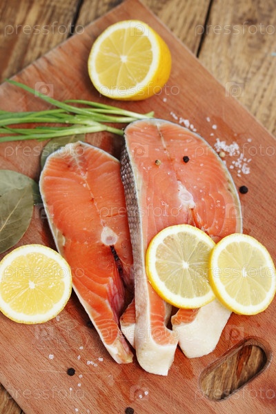 Стейки сырой красная рыба с лимоном и специями