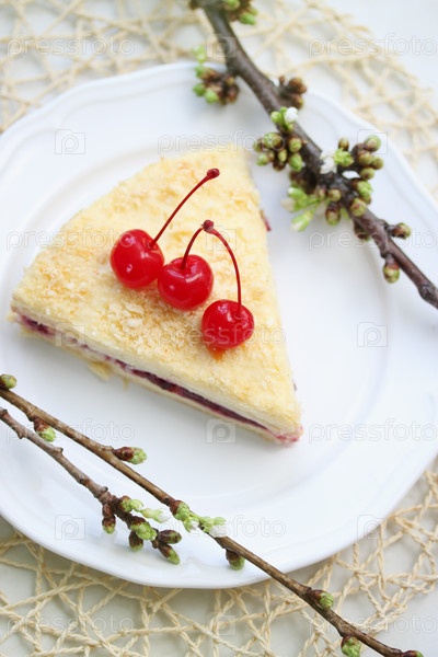 Торт Наполеон с вишней на тарелке