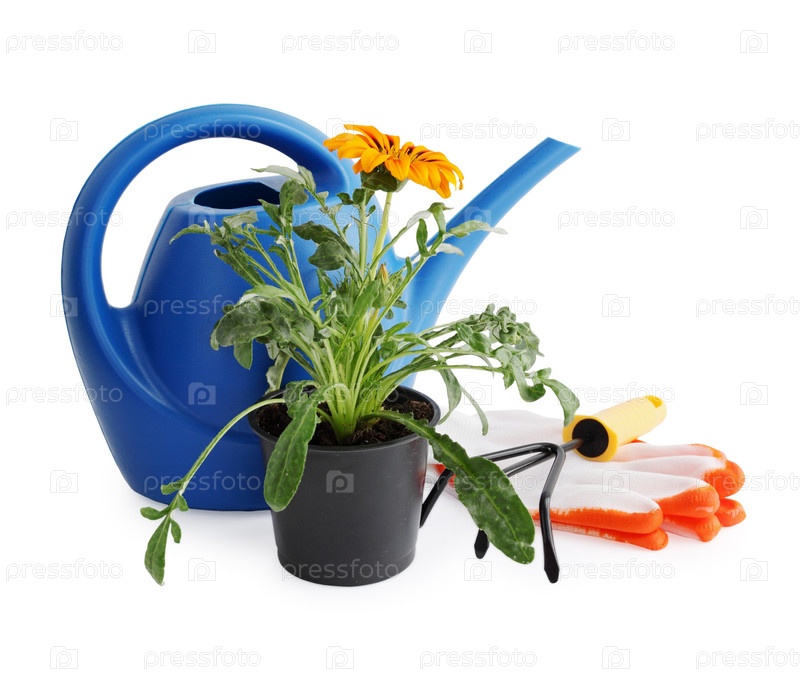 Сад Натюрморт на белом фоне, цветок, Лейка и вилы