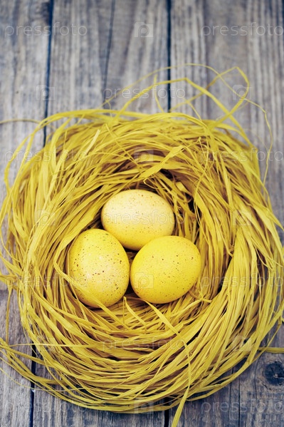 Пасхальный натюрморт в оттенки желтого, гнезда с яйцами