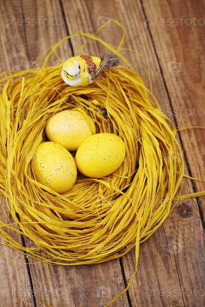 Пасхальный натюрморт в оттенки желтого, гнезда с яйцами