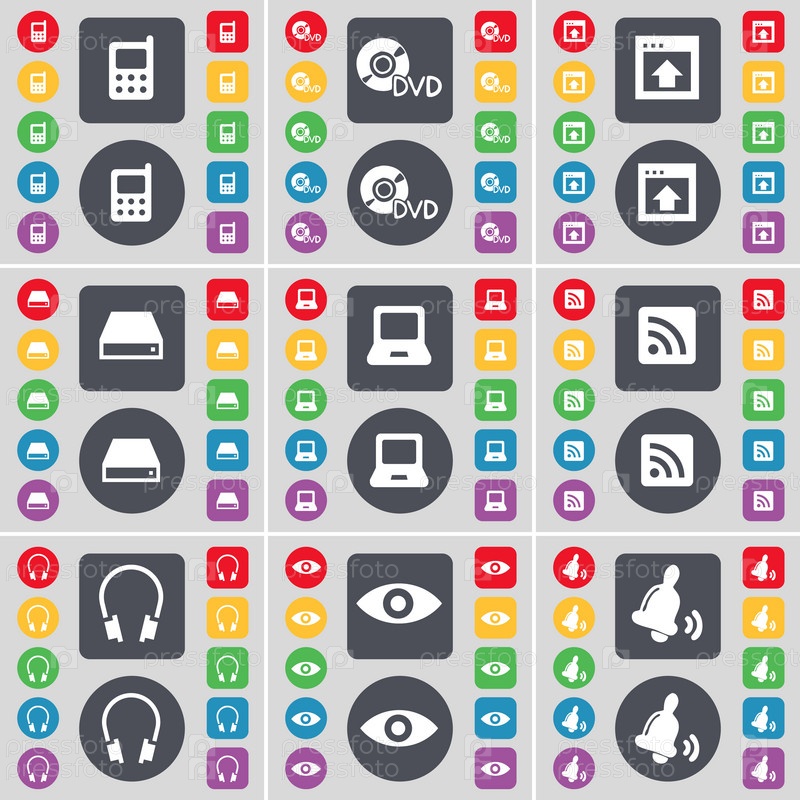 Мобильный телефон, DVD, окна, жесткий диск, ноутбук, наушники, RSS, видение, символ значка Белл. большой набор плоских цветных кнопок для вашего дизайна. вектор