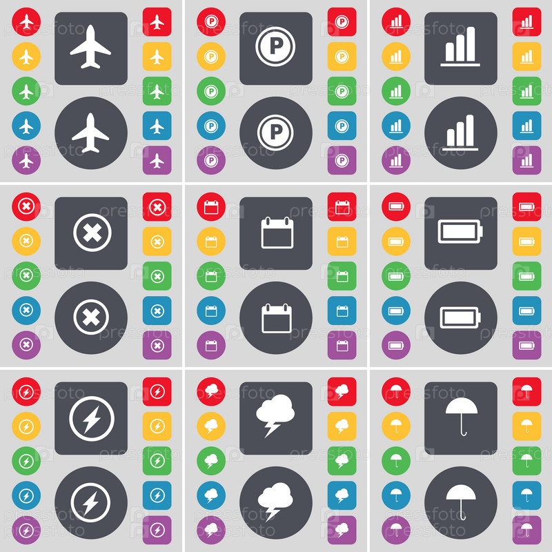 Самолет, парковка, диаграмма, остановка, календарь, батареи, флэш, Nightning, символ значка зонтика. большой набор плоских цветных кнопок для вашего дизайна. вектор