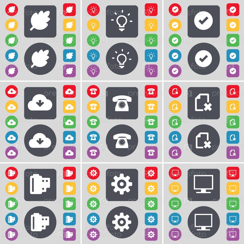Лист, лампочки, тик, облако, ретро телефон, файл, негативных фильмов, передач, монитор значок символа. Большой набор плоских, цветные кнопки для вашего дизайна. Вектор