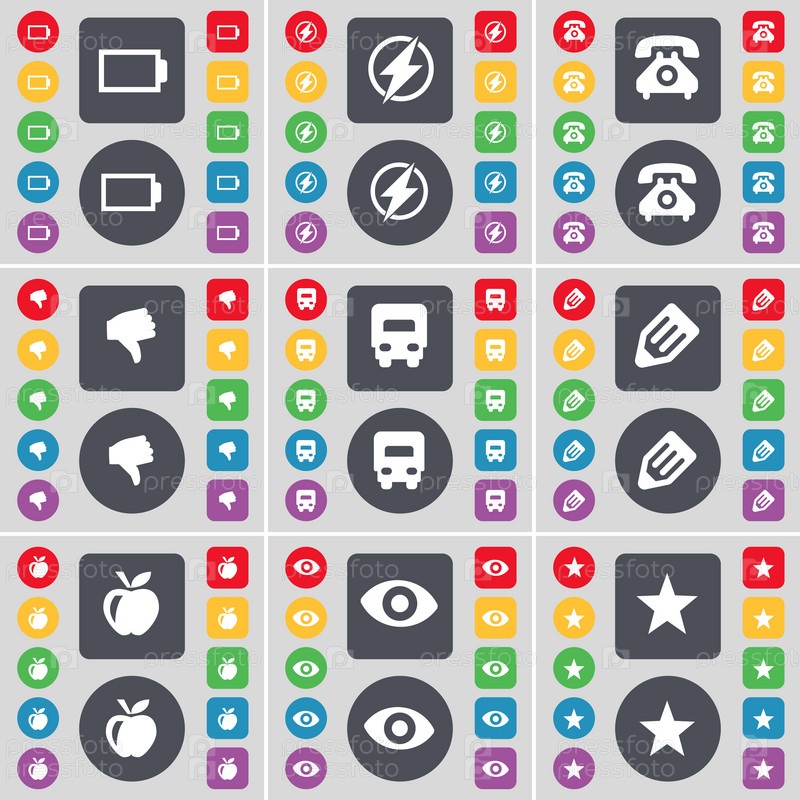 Батареи, флэш, ретро телефон, неприязнь, грузовик, карандаш, яблоко, видение, звезда значок символа. Большой набор плоских, цветные кнопки для вашего дизайна. Вектор