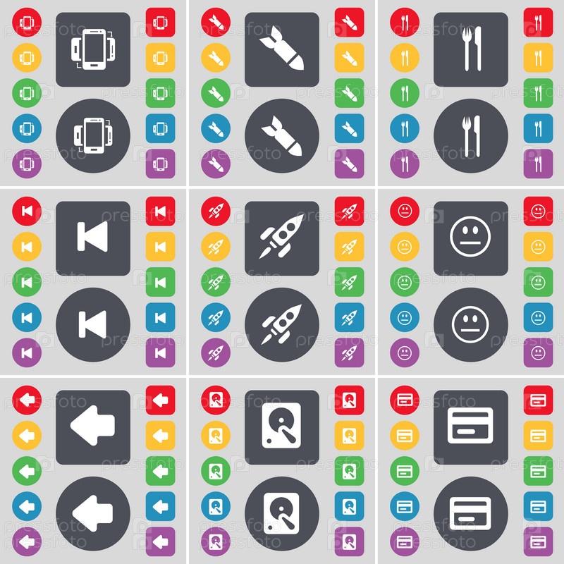 Смартфон, ракета, вилка и нож, пропустить СМИ, улыбка, стрелка слева, жесткий диск, кредитной карты значок символа. Большой набор плоских, цветные кнопки для вашего дизайна. Вектор