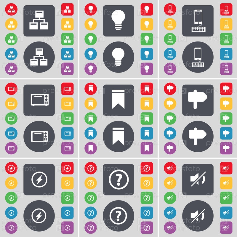 Сеть, лампочки, смартфон, микроволновая печь, маркер указателя, значок символа Fl. Большой набор плоских цветных кнопок для вашего дизайна