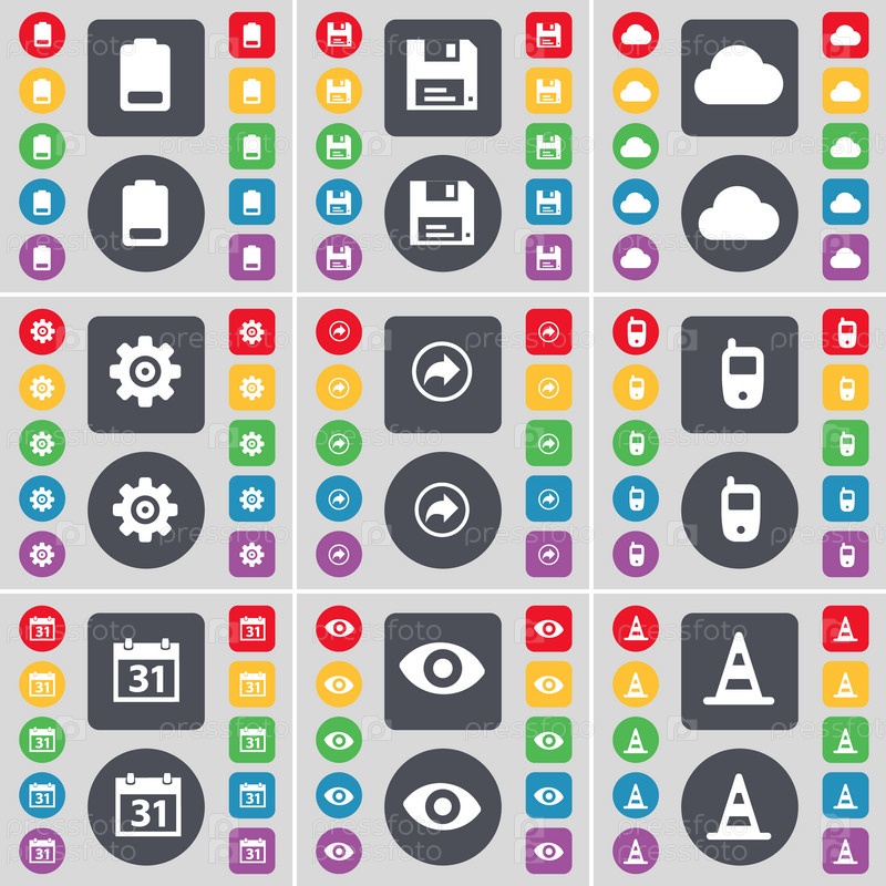 Аккумулятор, флоппи, облако, снаряжение, обратно, мобильный телефон, календарь, видение, конус значок символа. Большой набор плоских, цветные кнопки для вашего дизайна. Вектор
