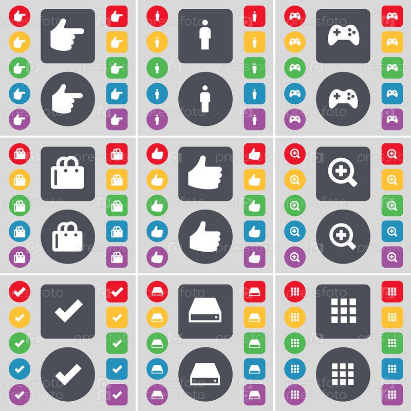 Стороны, силуэт, геймпад, покупки мешок, как, увеличительное стекло, тик, жесткий диск, символ значок приложения. Большой набор плоских, цветные кнопки для вашего дизайна. Вектор