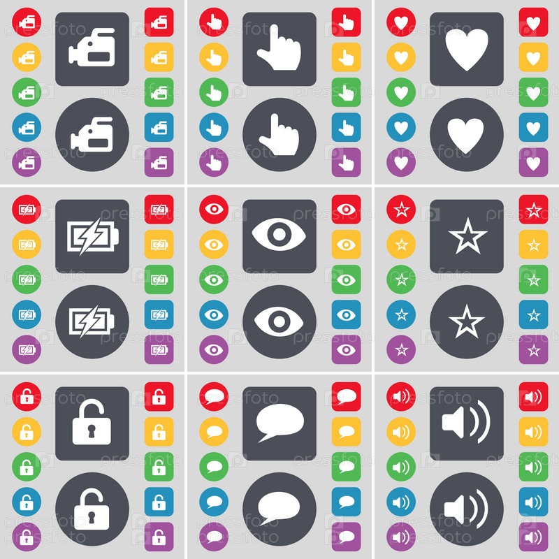 Фильм камеры, руки, сердце, зарядка, видение, звезда, замок, чат пузырь, символ значок звука. Большой набор плоских, цветные кнопки для вашего дизайна. Вектор
