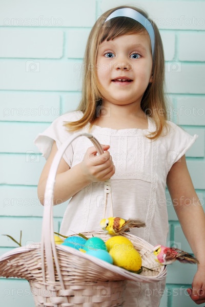 Воодушевленная девочка держит корзину с крашеными яйцами
