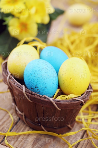 Пасхальный натюрморт в оттенками желтого, гнездо с яйцами