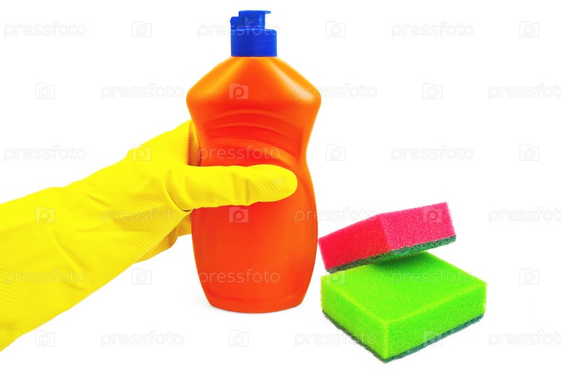 Бутылка оранжевого цвета с моющим или очищающим средством и губки на белом фоне