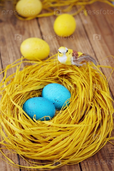 Пасхальный натюрморт в оттенки желтого, гнезда с яйцами
