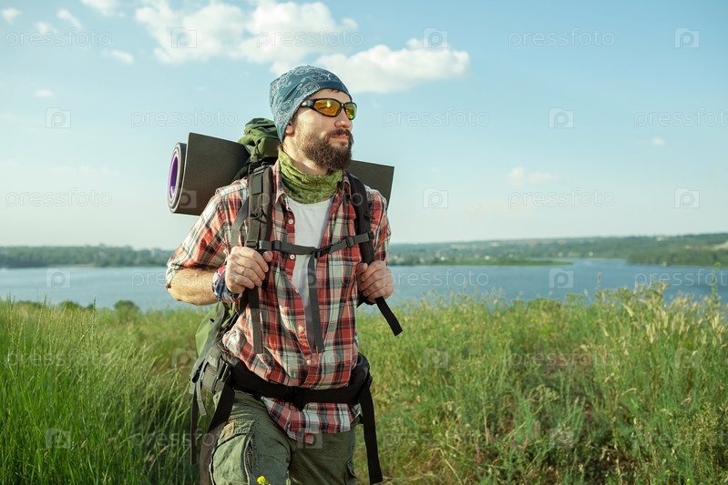 Мужчина с рюкзаком на вершине холма