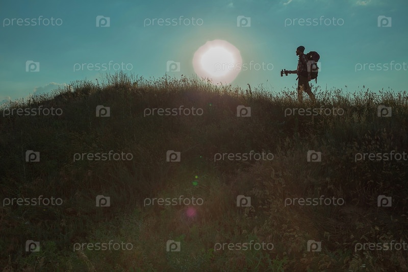 Мужчина с биноклем и рюкзаком на вершине холма