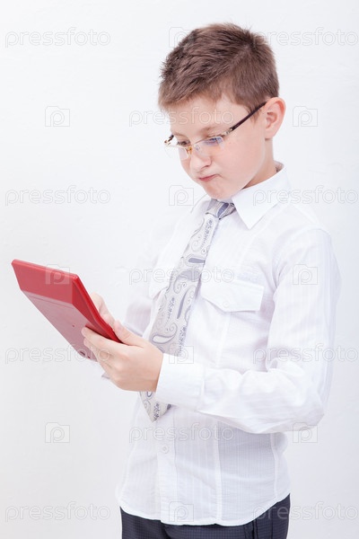 Мальчик считает на красном калькуляторе