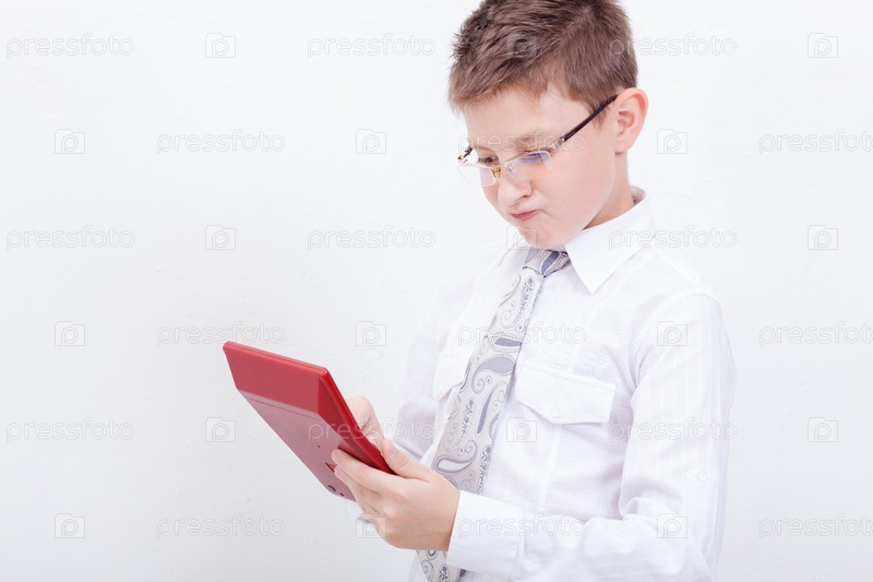 Мальчик задумчиво держит красный калькулятор