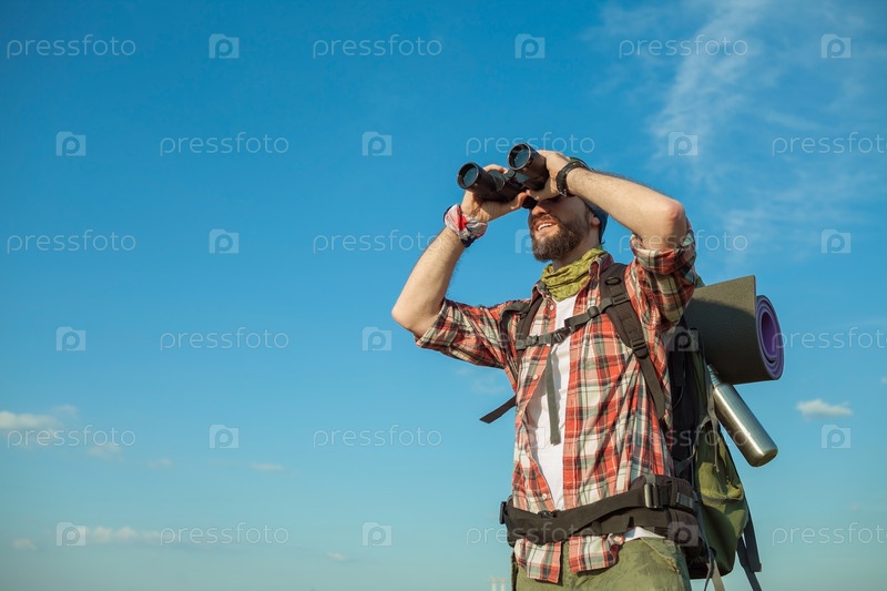 Мужчина с рюкзаком смотрит в бинокль