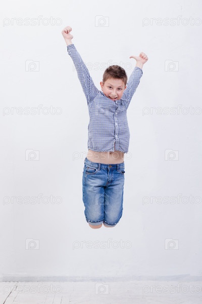 Счастливый мальчик прыгает на белом фоне
